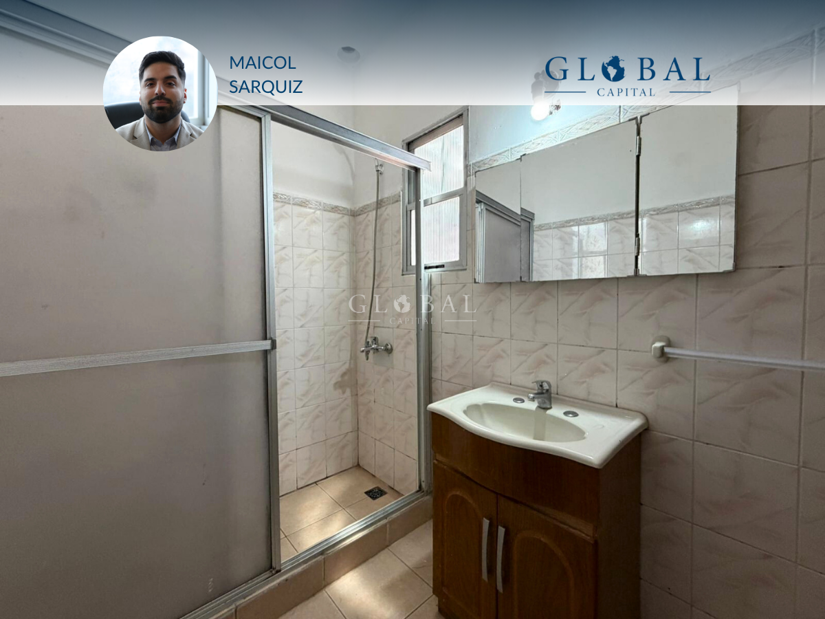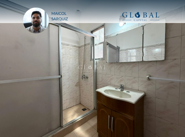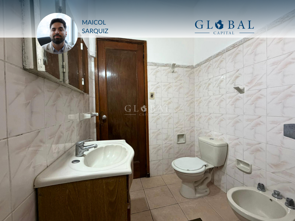Baño completo ubicado en el centro de la unidad, con conexiones para calefón y lavarropas.