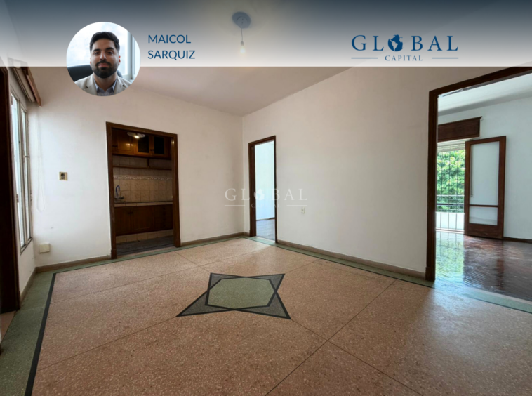 A su ingreso se accede a un living comedor con piso de monolítico. Desde allí se distribuyen dos dormitorios con pisos de parqué; uno de ellos cuenta con placard empotrado. Ambos dormitorios tienen salida a balcón al frente, sobre la calle República.